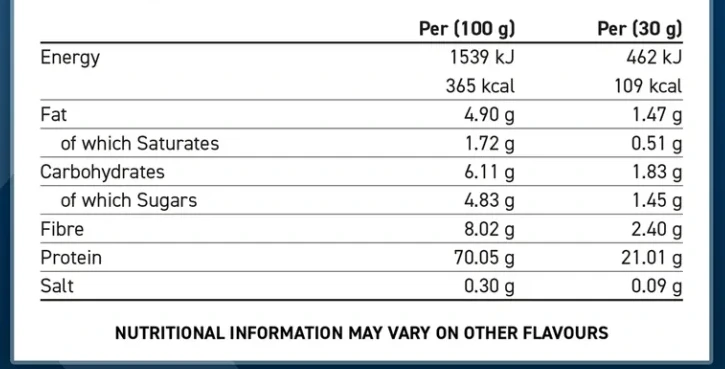 Whey Protein Concentrate (Milk) (Sunflower Lecithin), ISO-XP Whey Protein Isolate (Milk), Hydrolysed Whey Protein (Milk), Flavouring, Sweetener (Sucralose), Colour (Turmeric Extract).